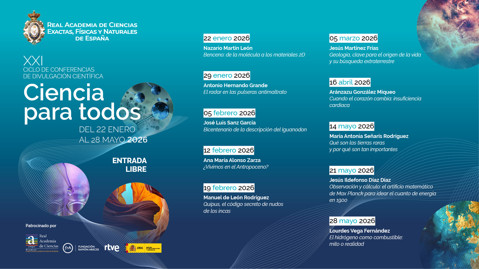 Programa de alta divulgación científica, celebrado en la sede la Academia, que ofrece una visión actualizada y asequible a un público general interesado en la ciencia, de los aspectos más novedosos de sus diferentes disciplinas, a través de conferencias presentadas por especialistas de renombre internacional.