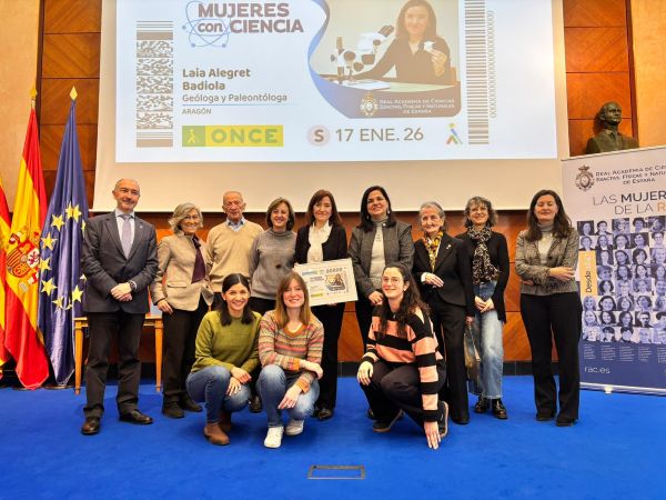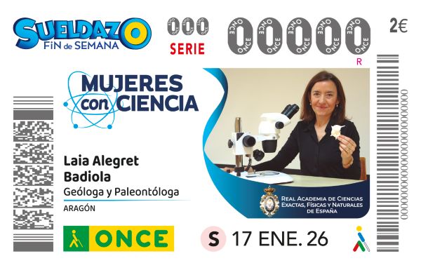 Este miércoles se ha presentado en Zaragoza el cupón de la ONCE correspondiente a Aragón y protagonizado por la paleontóloga y Académica de la RAC, Laia Alegret.